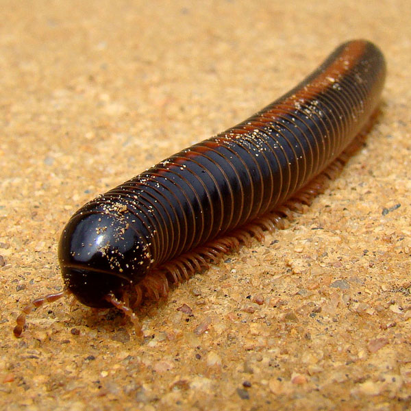 Archispirostreptus gigas, known as the giant African millipede or shongololo, is the largest extant species of millipede, growing up to 38.5 centimetres (15.2 in) in length, 67 millimetres (2.6 in) in circumference. It has approximately 256 legs, although the number of legs changes with each molting so it can vary according to each individual.